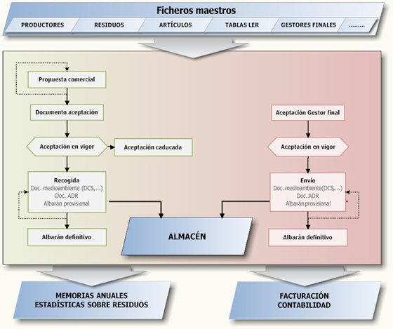 De forma básica podemos apreciar que los Ficheros maestros alimentan el Sistema de producción. Éste tiene a la izquierda los procedimientos dirigidos a la recogida de residuos y a la derecha los destinados al envío a gestores finales. Por último, todo el sistema alimenta a potentes programas de Facturación y Contabilidad y nos permite obtener los Informes anuales que deben presentarse a la Administración.